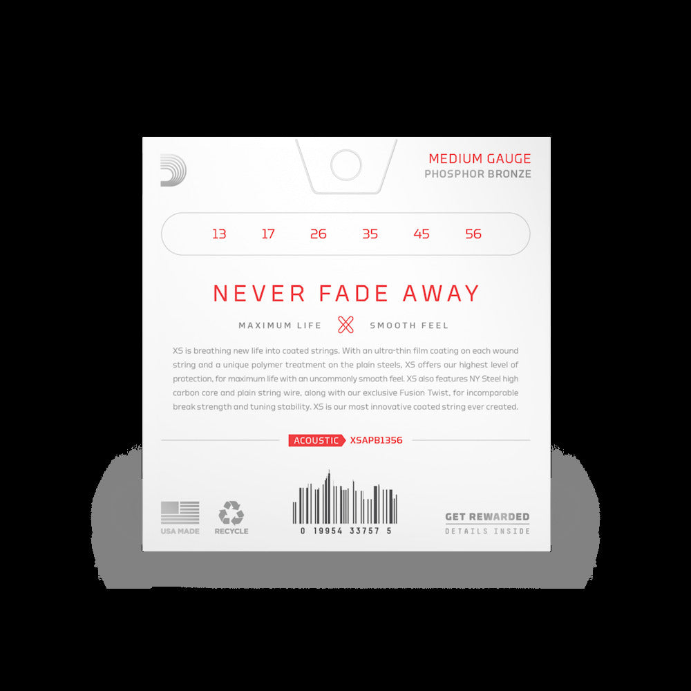 Born from our greatest breakthrough in string innovation, XS Phosphor Bronze strings have the longest life of any D’Addario acoustic guitar string. The XS coating gives our bold, bright phosphor bronze strings maximum life, with an uncommonly smooth feel. Made with a NY Steel core, phosphor bronze wrap wire, and Fusion Twist technology, XS coated acoustic guitar strings have incomparable break strength and tuning stability, in addition to their dramatically increased lifespan. This 13-56 Medium gauge set provides maximum volume and projection, with more tension and resistance.