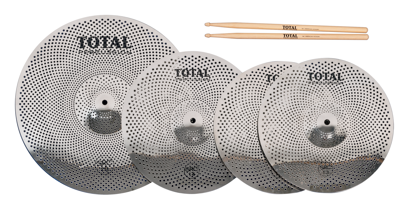 Sound Reduction Cymbals from Total Percussion allow you to PLAY 24/7. Utilising a proprietary Stainless Steel alloy, these cymbals are specifically designed to reduce volume for 24/7 practice, but not enough to lose tone and pitch. SRC cymbals offer a reduced sound playing level for smaller acoustic gigs that can also be mic'd through a PA. SRC cymbals work perfectly in conjunction with Remo Silentstroke drumheads for low volume practice on your own acoustic kit. SRC cymbal set includes: 1 x Pair SRC13PR - 13" Hi-Hats, 1 x SRC14 - 14' Crash Cymbal, 1 x SRC18 - 18" Ride Cymbal. Plus a pair of Total Percussion 5A American Hickory drumsticks - all supplied in a striking, full colour gift box.