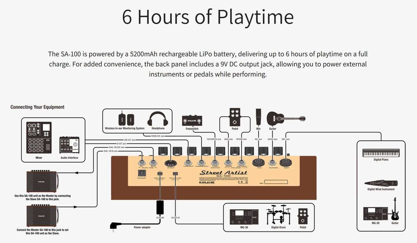 The NUX SA-100 is a rechargeable amplifier built for busking, live streaming, and recording. It features a warm, Class A discrete analog preamp, high-quality DSP-driven digital effects, and a powerful 100W peak Class D amplifier. With its advanced five-speaker setup—an 8-inch bass driver and four 2.75-inch tweeters—it delivers deep lows, clear highs, and impressive volume, making it the perfect choice for busking and outdoor events.