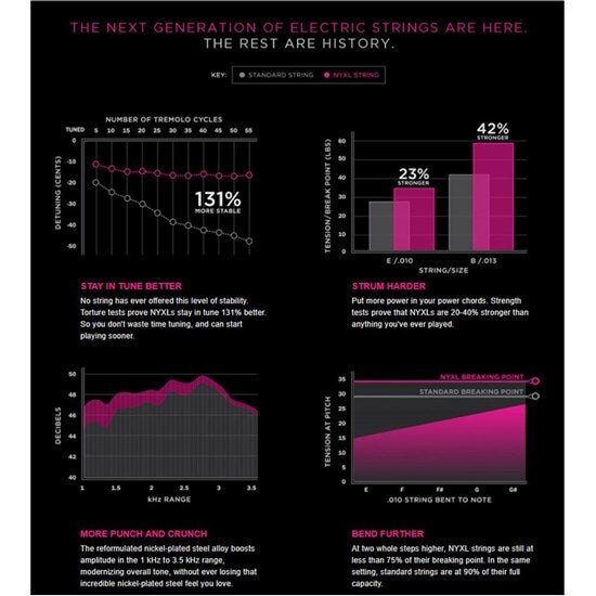 NYXLs will bend farther, sing louder, and stay in tune better than any string you’ve played before. As our premium uncoated electric string, NYXLs offer higher break strength, enhanced tuning stability, and accentuated mid-range frequency response, providing more presence and crunch to cut through the mix. Made with a NY Steel core, premium nickel-plated steel wrap wire, and Fusion Twist technology, NYXL electric guitar strings are tough enough and versatile enough to handle anything. 11-52 Medium Top/Heavy Bottom gauge strings are a hybrid, providing the high strings moderate flexibility, with a booming, tight low-end.