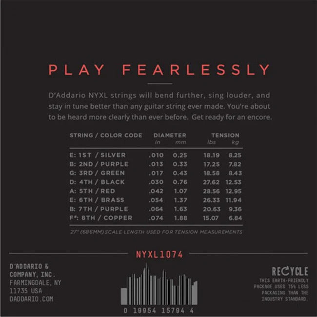 NYXLs will bend farther, sing louder, and stay in tune better than any string you’ve played before. As our premium uncoated electric string, NYXLs offer higher break strength, enhanced tuning stability, and accentuated mid-range frequency response, providing more presence and crunch to cut through the mix. Made with a NY Steel core, premium nickel-plated steel wrap wire, and Fusion Twist technology, NYXL electric guitar strings are tough enough and versatile enough to handle anything. This 10-74 Light Top/Heavy Bottom 8-String set combines the high strings from a regular set with heavier low strings, delivering powerful lows and smooth bending.