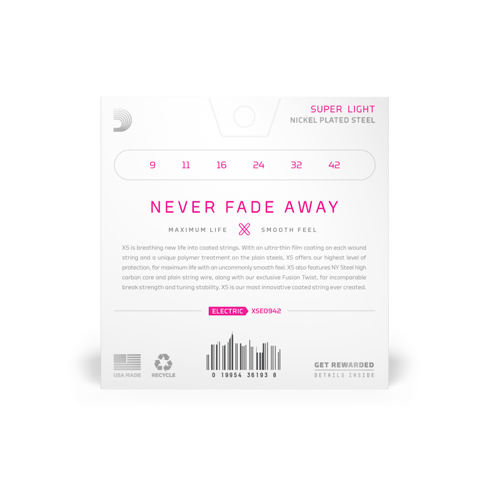 XS Nickel coated electric guitar strings provide the longest life of any D’Addario electric guitar string. Coated with our groundbreaking XS coating, these premium electric strings attain maximum life and a smooth, fast feel without dampening their outstanding tone. Constructed with a NY Steel core, reformulated nickel-plated steel wrap wire, and Fusion Twist technology, XS Nickel strings boast superior strength and tuning stability, plus richer harmonics, greater clarity, and remarkable definition with every sweep, slide, and bend. This 9-42 Super Light gauge set is easy to bend and very flexible.