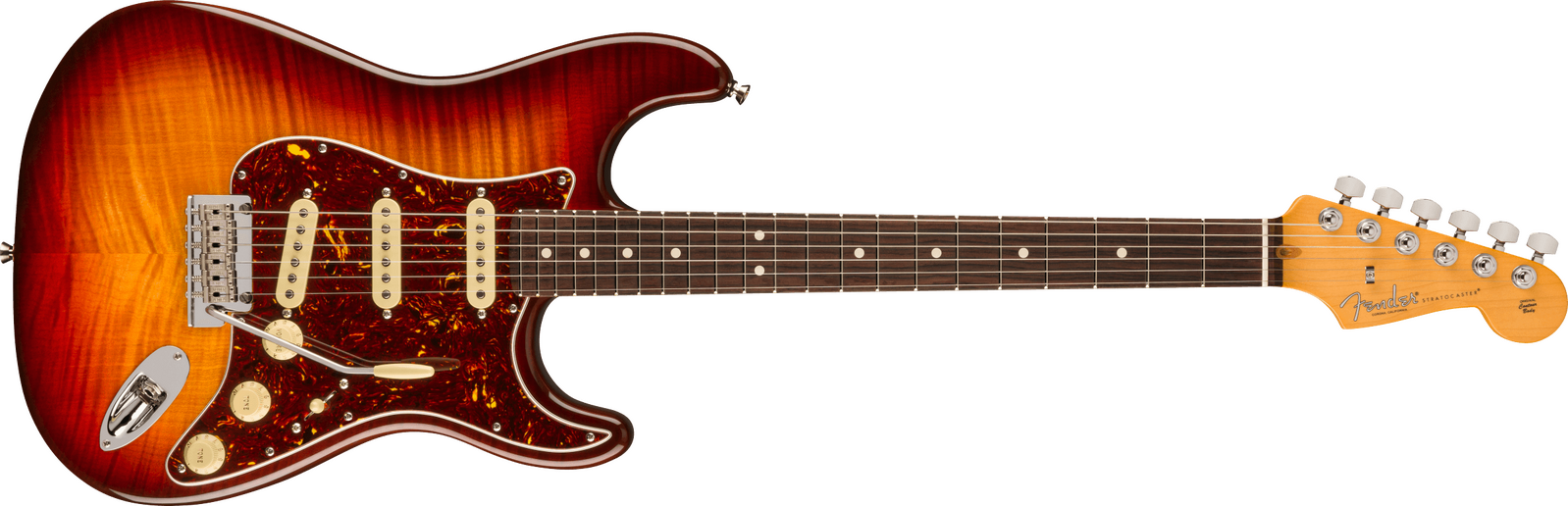 Take your playing to new heights with the 70th Anniversary American Professional II Stratocaster. The alder body, stunning flame maple top and Comet Burst finish exude elegance and class. Equipped with 70th Anniversary V-Mod II Single-Coil Strat® pickups, this guitar delivers dynamic and expressive tones. The Deep "C" neck features smooth rolled fingerboard edges, "Super-Natural" satin finish and sculpted neck heel for a supremely comfortable feel and easy access to the upper register. An upgraded 2-point tremolo with a cold-rolled steel block increases sustain, clarity and high-end sparkle. Deluxe locking tuners ensure exceptional tuning stability. The American Pro II Stratocaster delivers instant familiarity and sonic versatility you'll feel and hear right away, with broad ranging appointments that add up to nothing less than a new standard for professional instruments. The Inca Silver ABS molded case provides reliable protection for your prized instrument.