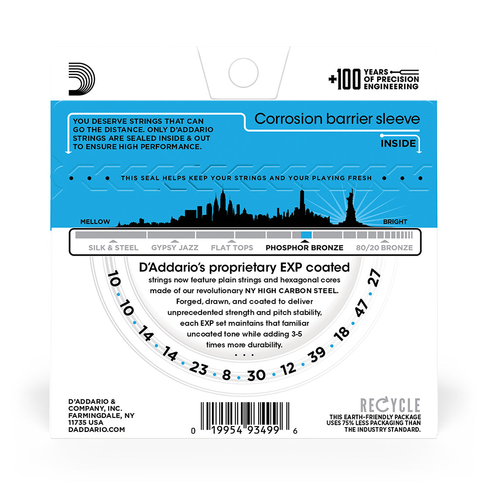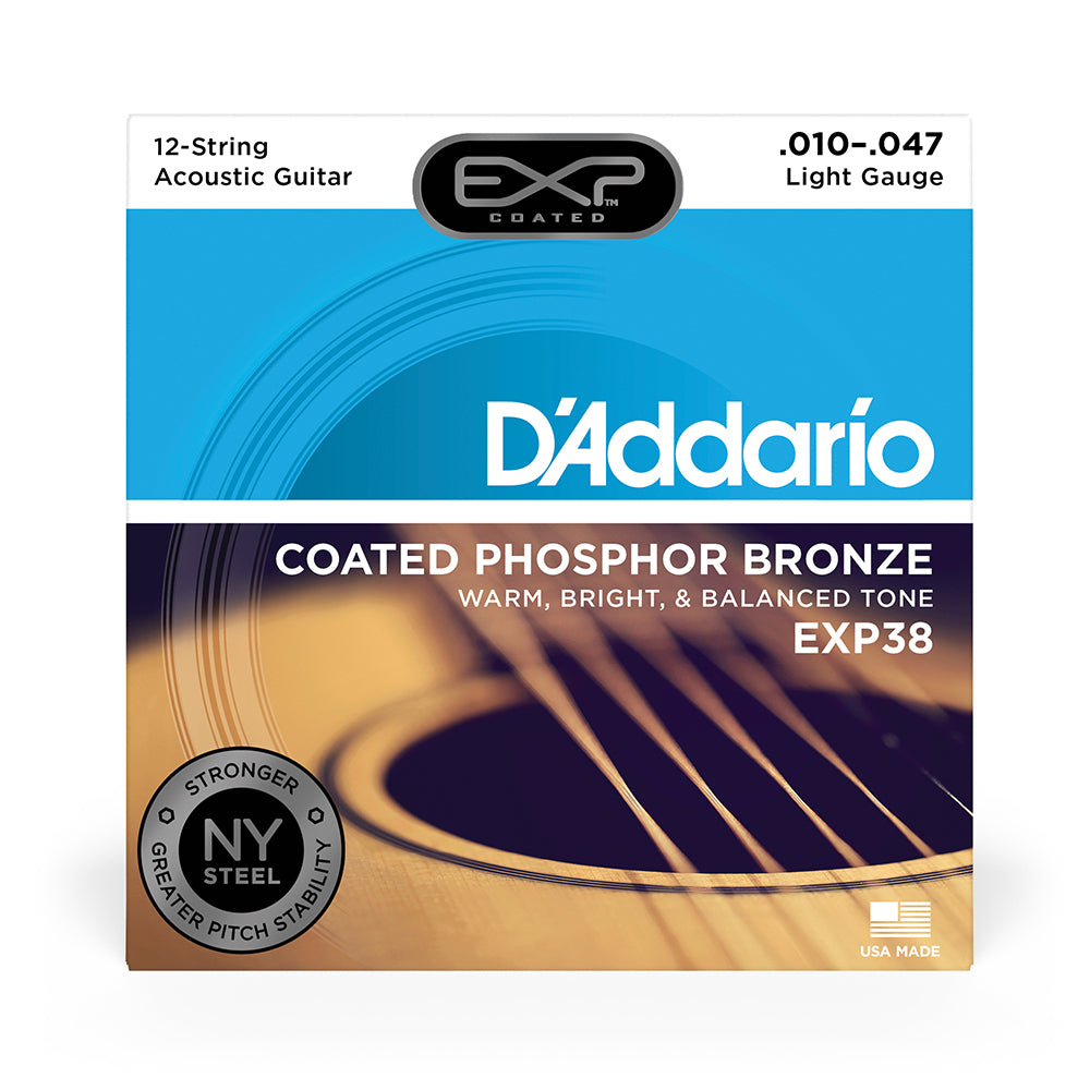 EXP38, D'Addario's most popular 12-string set, offers the ideal balance of volume, projection and comfortable playability. Designed for all makes and models of 12-string acoustic guitars.