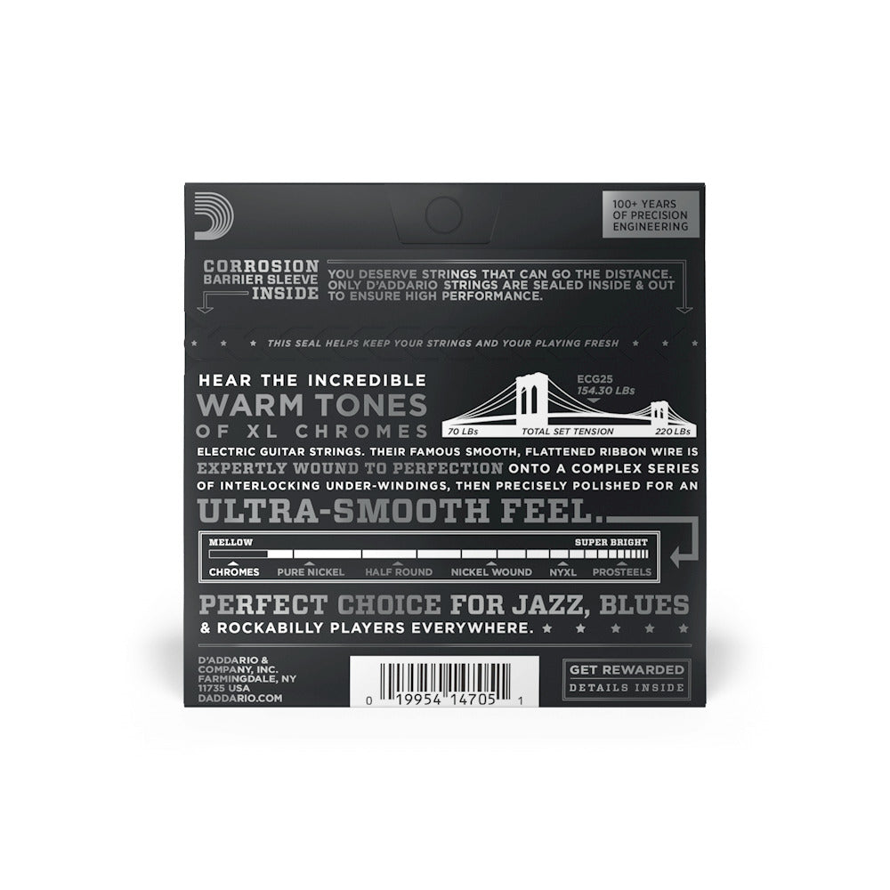 The D'Addario ECG25 is a popular flat wound set with smooth feel, warm/mellow tone and tighter tension XL Chromes are noted for their smooth feel and warm, mellow tone, essential to the sound and style of many jazz, blues, and rock players.
