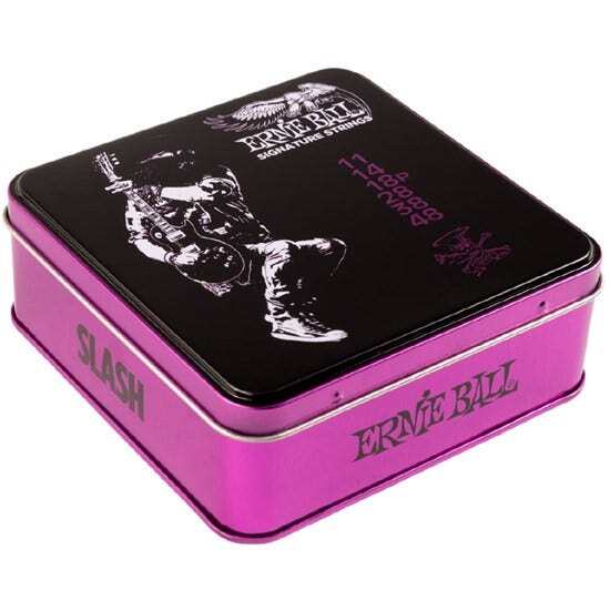 Ernie Ball introduces a limited edition set of custom wound Slash signature Slinky strings. Slash’s new signature string sets are the culmination of over three decades of Slash and Ernie Ball’s ongoing pursuit to create strings that provide more durability and tuning stability without sacrificing tone or feel. These new sets consist of his preferred 11-48 gauge Slinkys wound with Paradigm core wire and plasma-enhanced nickel-plated steel wrap wire, while the Paradigm plain strings are constructed with a heavier brass wire reinforcement at each of the ball ends for better tuning stability and strength. These limited edition string sets are highly collectible and conveniently packaged in a three-pack tin box for easy storage.