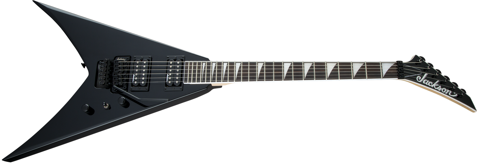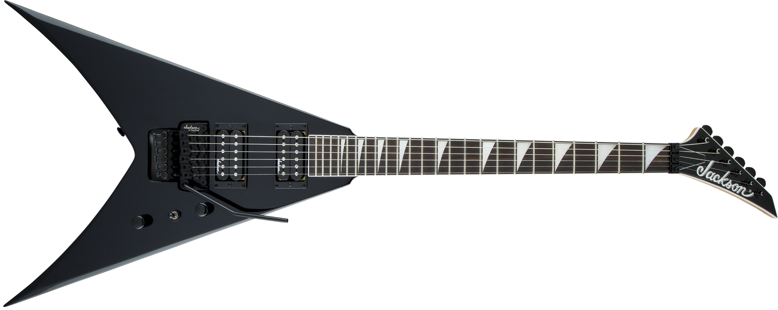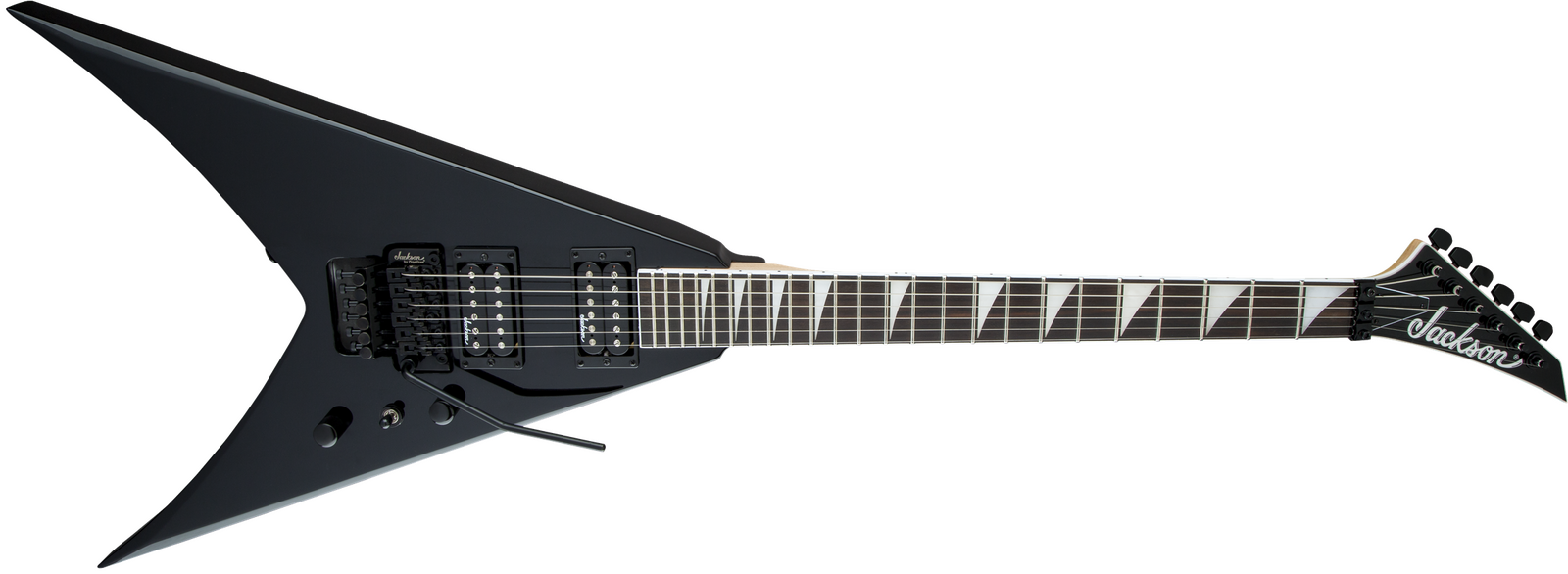 Other features include dual Jackson high-output humbucking pickups with ceramic magnets and three-way toggle switching, Jackson-branded Floyd Rose® double-locking tremolo bridge, standard strap buttons and sealed die-cast tuners.
