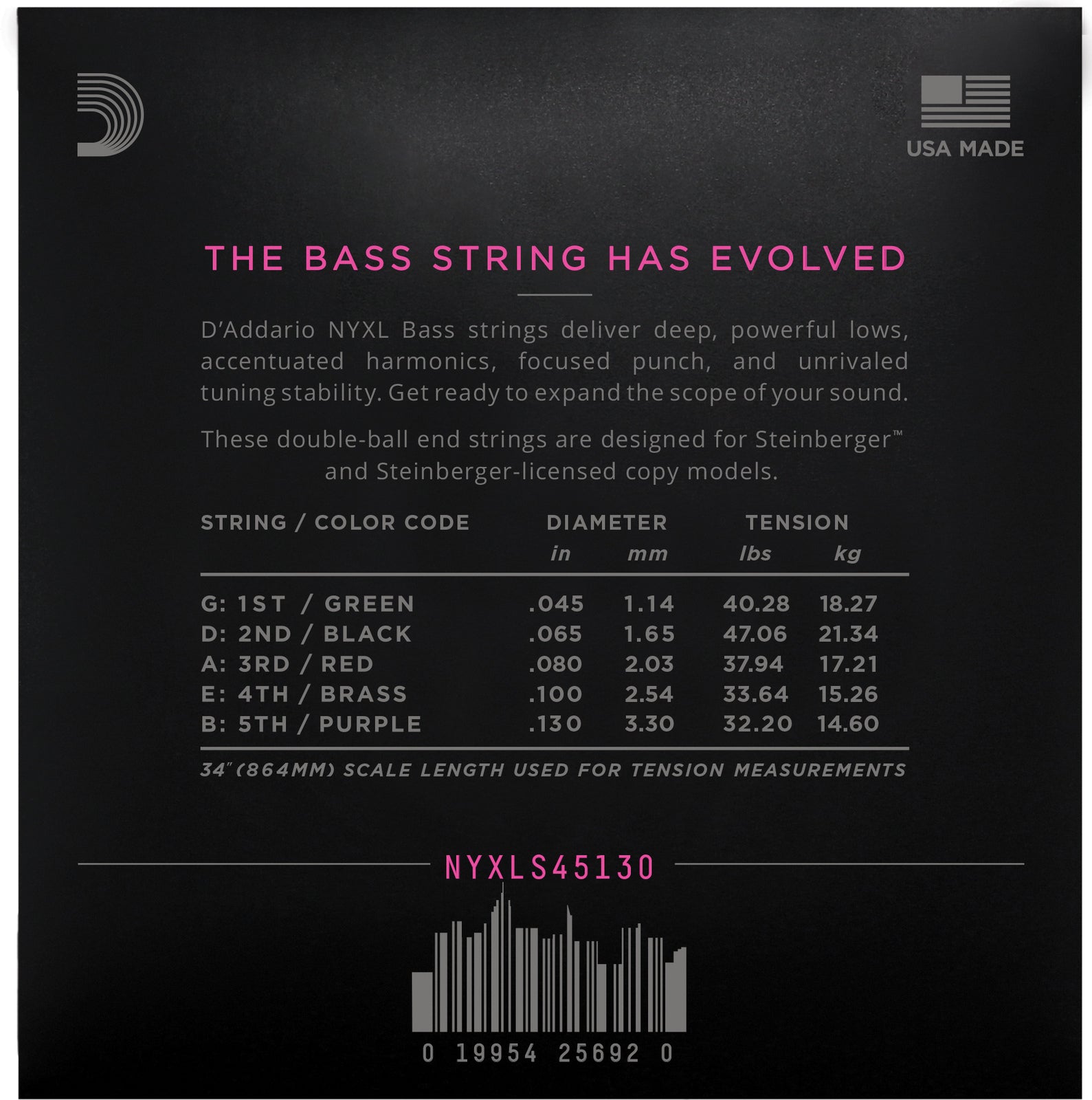 D'Addario's NYXL electric bass string sets feature the innovative combination of NYXL nickel-plated wrap wire wound on our NY Steel core for expanded dynamic range and harmonic response. NYXL45130 provides 5-string players with an extremely versatile string set, including a deep, tight, low B-string, in our most popular gauge.
