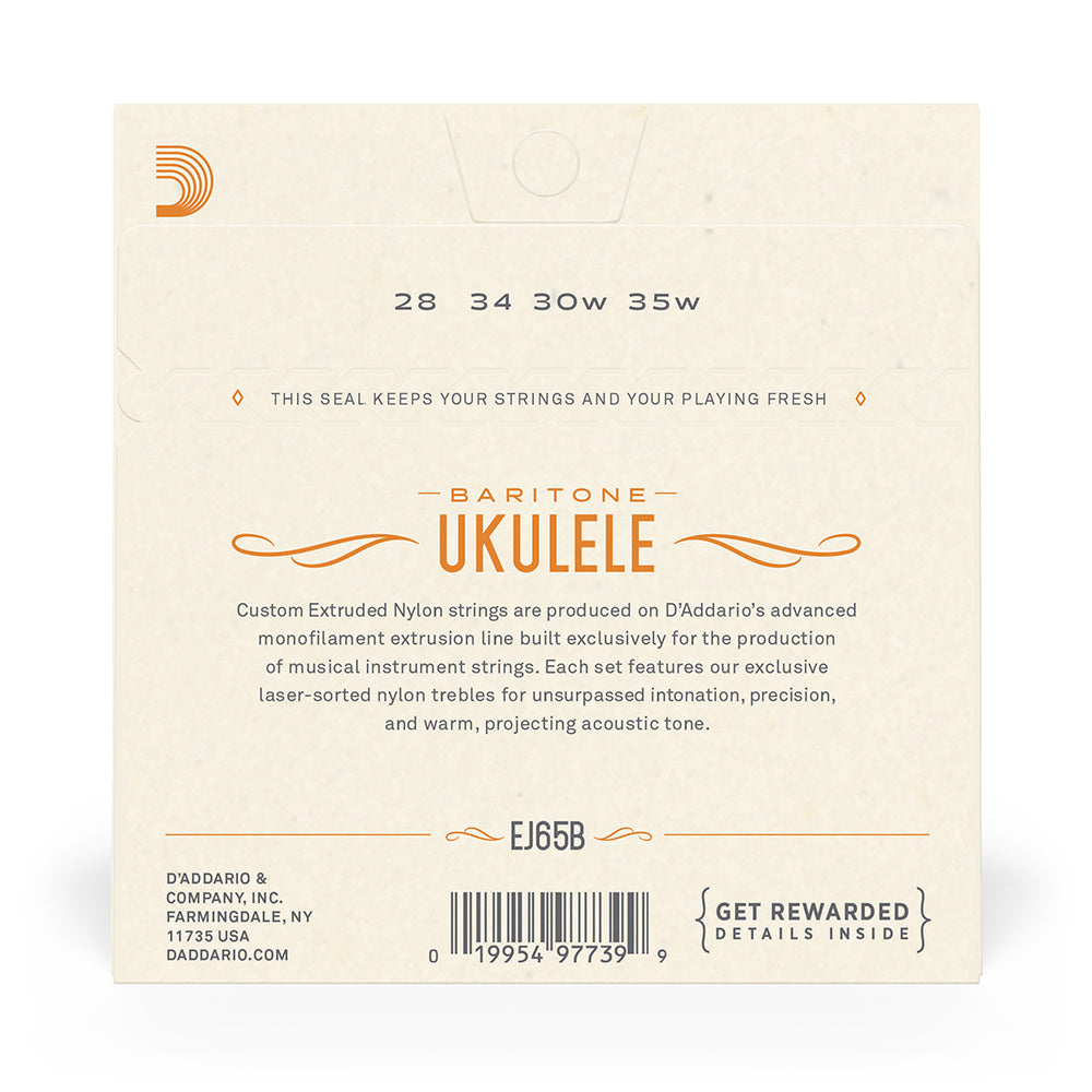D'Addario EJ65B strings are designed specifically for baritone ukuleles. The 3rd and 4th string are a silver-plated copper wound on nylon and complimented by a 1st and 2nd Pro-Art_ Custom Extruded clear nylon strings.